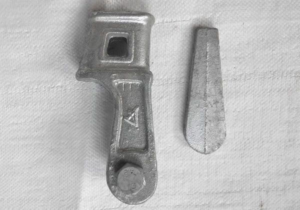楔型并溝線材料一般為鍛鋁,由弓形本體和楔塊兩部分組成;安裝或拆卸均使用槍形專用工具,但不可重復使用。楔塊兩側邊的斜度與本體的斜度相同,可使導線在被接觸段內均勻受力又可建立材料間的自鎖;弓形本體提供了為維持穩定壓力所需的彈力。弓形本體內槽的曲率半徑和楔塊外槽的半徑均略大于***大適用導線的半徑。在安裝時,將被接續的兩根平直導線放入本體兩側的對應位置,用人力將楔塊推至標志線位,再擊發槍形專用工具,使之產生瞬間推力將楔塊壓入工作位。對楔塊的壓力主要由專用子彈中的藥量決定,減少了人為因素對安裝質量的影響,所以楔型并溝線夾安裝的一致性較好。楔型并溝線夾可接續等徑和異徑的兩根導線。楔型并溝線夾對導線握力約為導線計算拉斷力的20%-45% 。