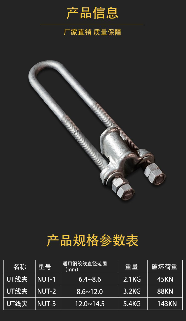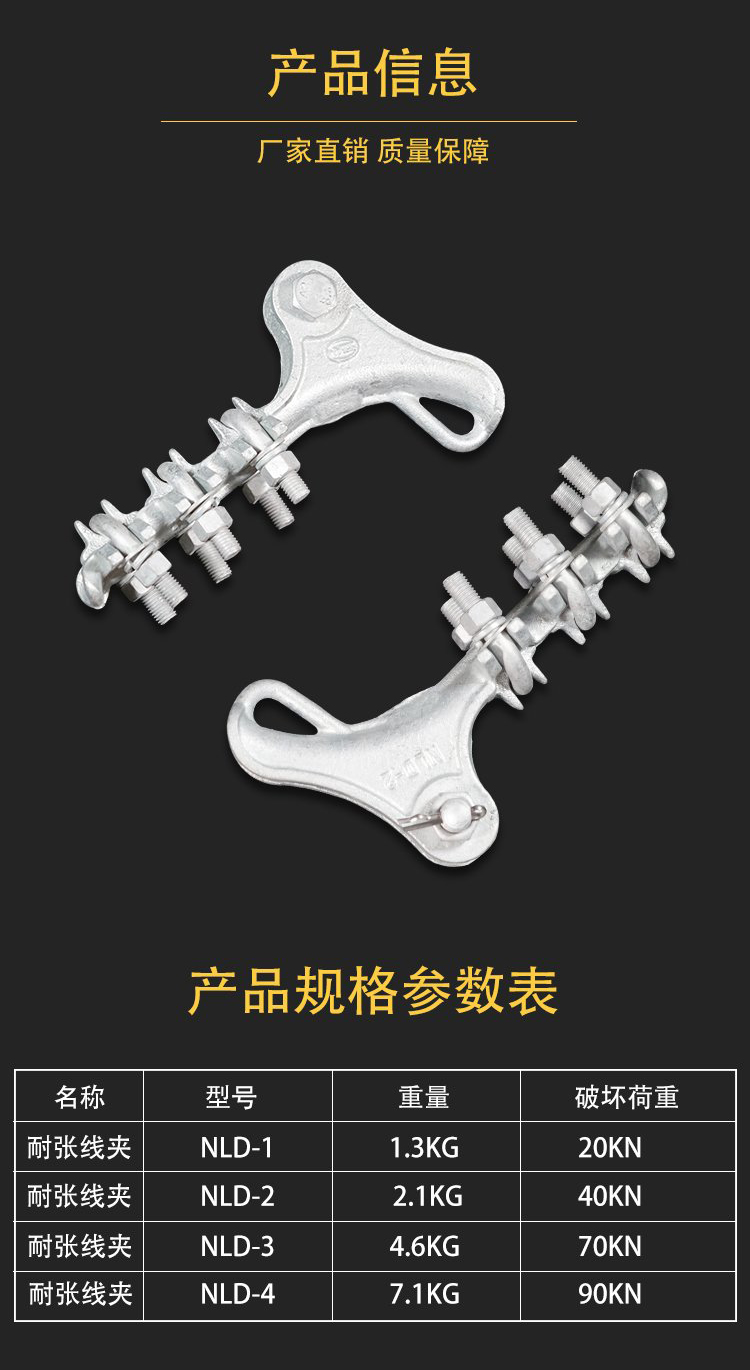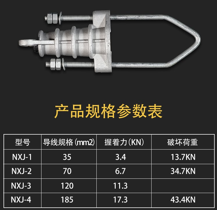 2)、錨固金具。又稱緊固金具或耐線線夾。這種金具主要用來緊固導線的終端,使其固定在耐線絕緣子串上,也用于避雷線終端的固定及拉線的錨固。錨固金具承擔導線、避雷線的全部張力,下圖為耐張線夾。