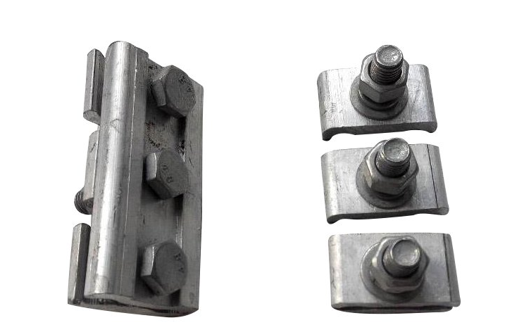 4)、接續金具。這種金具專用于接續各種裸導線、避雷線。接續承擔與導線相同的電氣負荷,大部分接續金具承擔導線或避雷線的全部張力,如接續管,并溝線夾,下圖為并溝線夾。