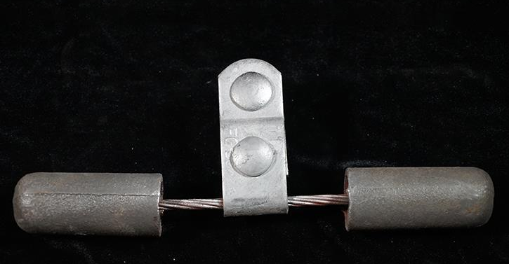 5)、防護金具。這種金具用于保護導線、絕緣子等,如保護絕緣子用的均壓環,防止絕緣子串上拔用的重錘及防止導線振動用的防振錘、護線條、間隔棒等,下圖為防震錘。